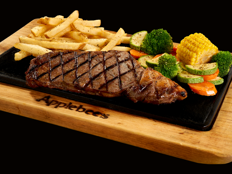 Applebee's MéxicoSecciones principales de la páginaJugoso corte Sirloin o Nueva York (280 g ). Se sirve con selección de dos guarniciones: puré de papa, vegetales al vapor, papas fritas o papas rojas sazonadas.