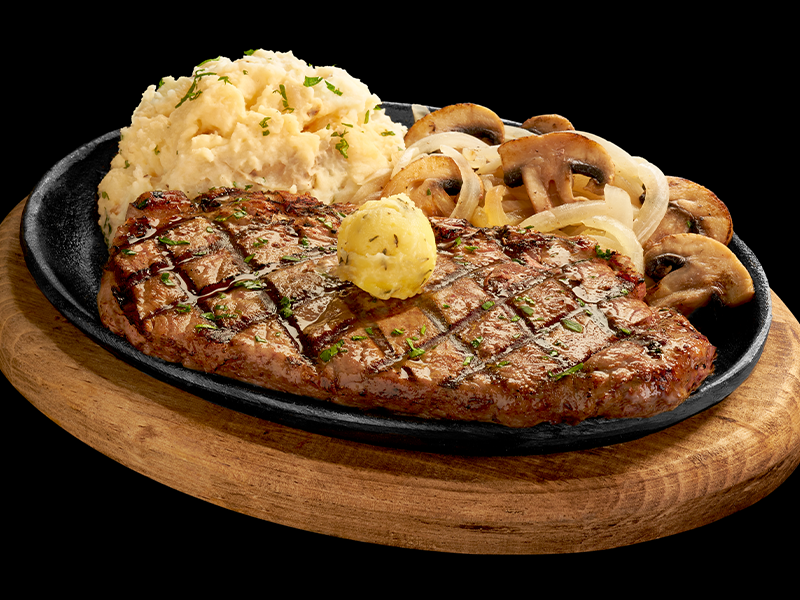 Applebee's MéxicoSecciones principales de la páginaSe sirve sobre una sartén caliente. Jugoso corte (280 g) estilo cajún, bañado con mantequilla de ajo y tomillo. Acompañado con selección de papas rojas sazonadas o puré de papa y champiñones salteados.